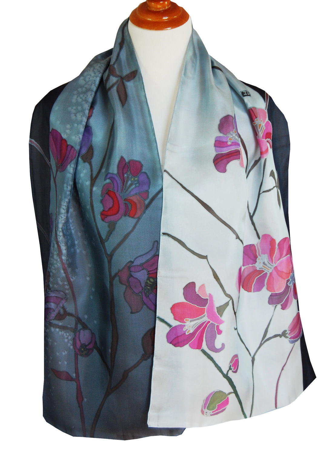 Hand Painted Silk Scarf Cherry Blossom in Gray Ombre