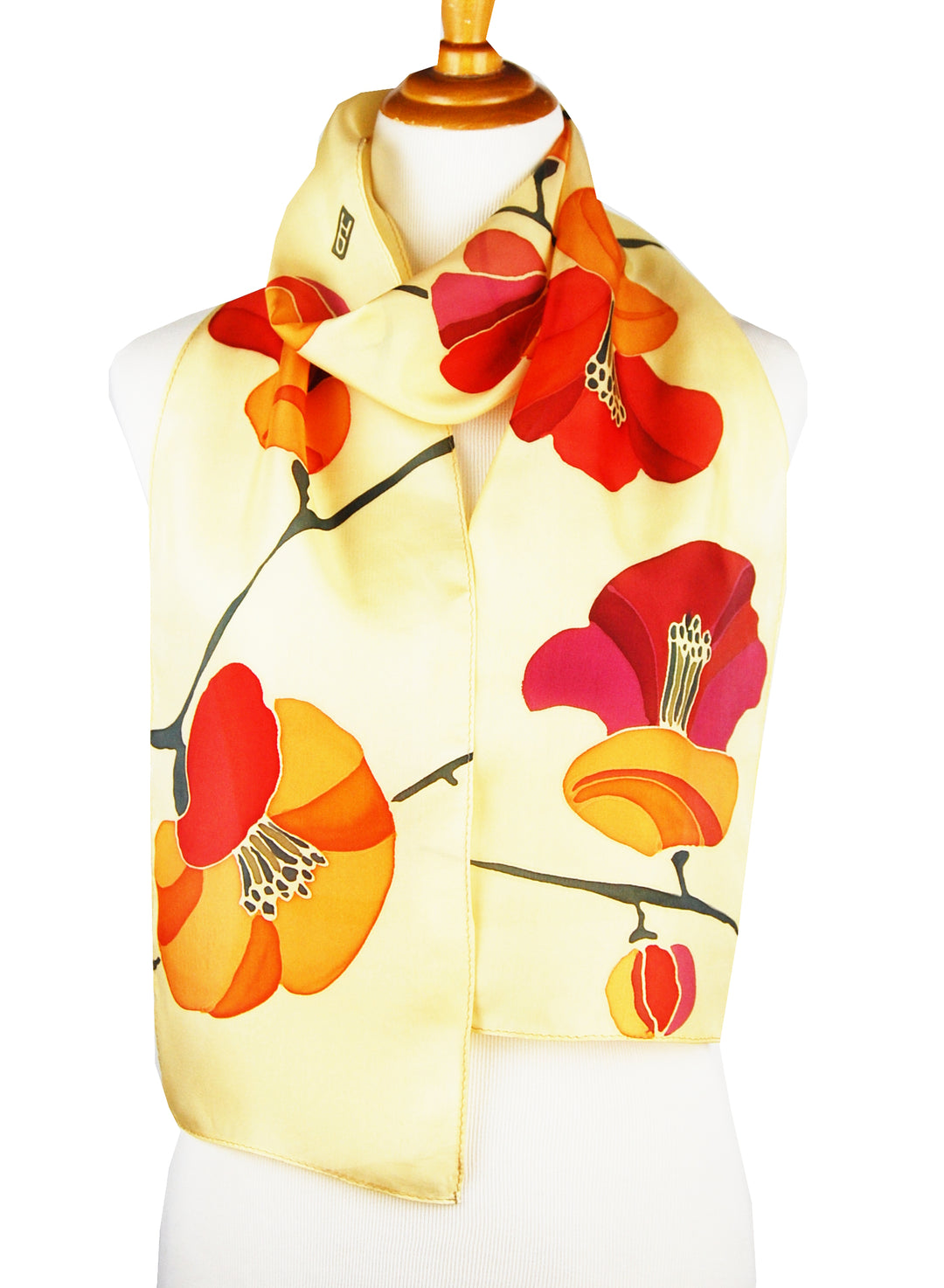 Hand Painted Silk Scarf Cherry Blossom in Vanilla Cream