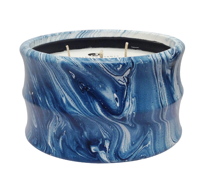 This stoneware ceramic, 3-wick vessel is hand-cast with white clay mixed with rust red to create a unique, marbelized pattern.