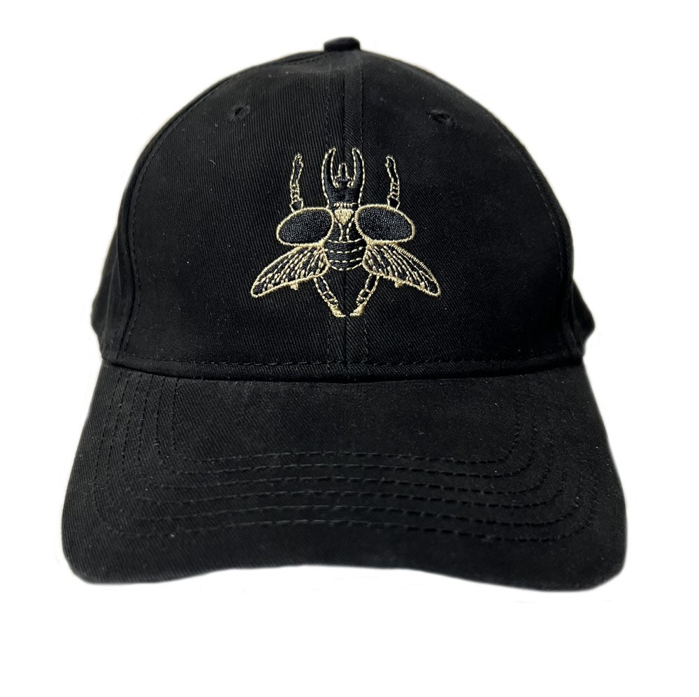 Adult Black 100% cotton denim cap with embroidered Museum logo on back and insect on front panel. Structured, six-panel, mid-profile. Pre-curved visor . Sewn eyelets. Undervisor color matches the crown. Tri-glide buckle closure. Museum exclusive!