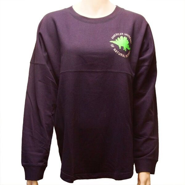 Perfect for fall and winter, this adult long sleeve dolman top in Dark Navy features a bright green Stegosaurus on the front along with the Museum name. On the back is New York and a larger Stegosaurus. It's made of 100% heavy cotton and is machine washable. Available in adult sizes SM to 2X.
