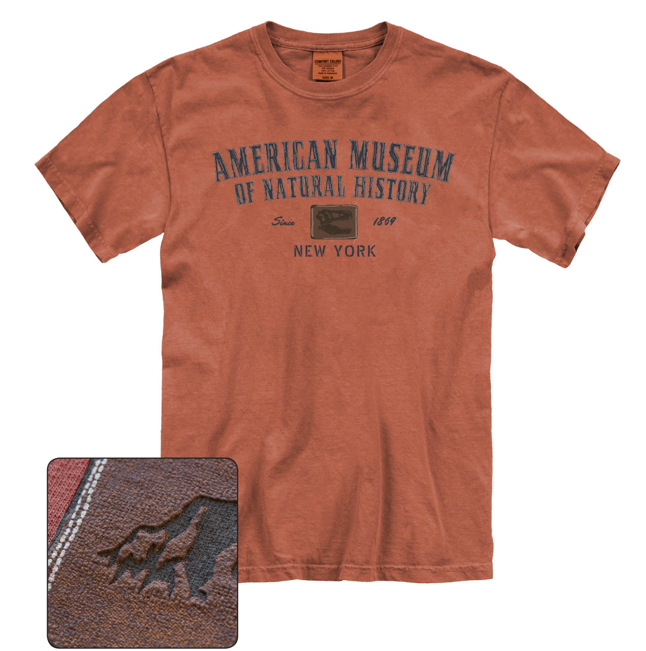Adult AMNH Since 1869 T-shirt features specialty inks and sculpture base for T. rex patch. Made of pre-shrunk 100% heavyweight cotton. Close up of patch is for reference only.