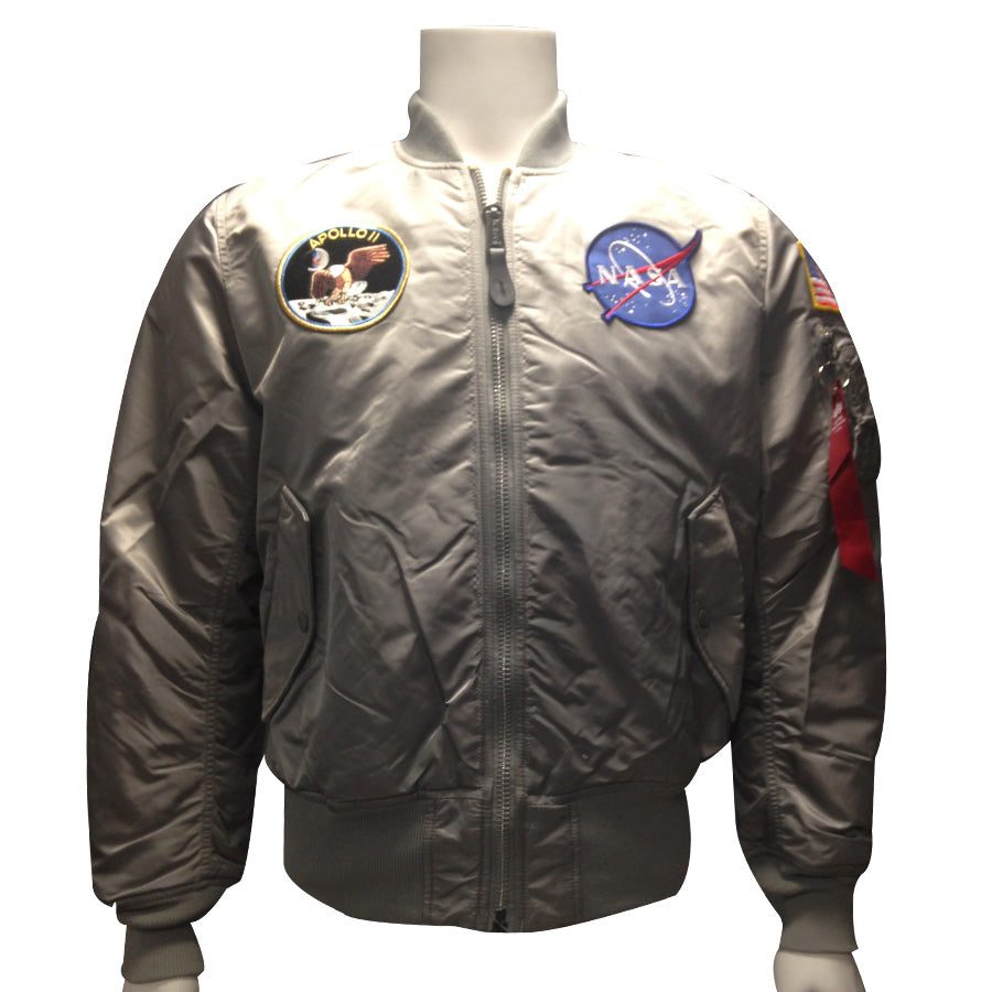 Adult Apollo Patch Bomber Jacket. A classic bomber jacket features allover embroidered NASA Apollo patches.It'g s got a front zip closure and rib-knit bandking the the collar, cuffs, and hem. Two snap button slip pockets and a zip utility pocket on the left sleeve. Complete with a 'Remove Before Flight' ribbon. Sizes available are XS to XL.