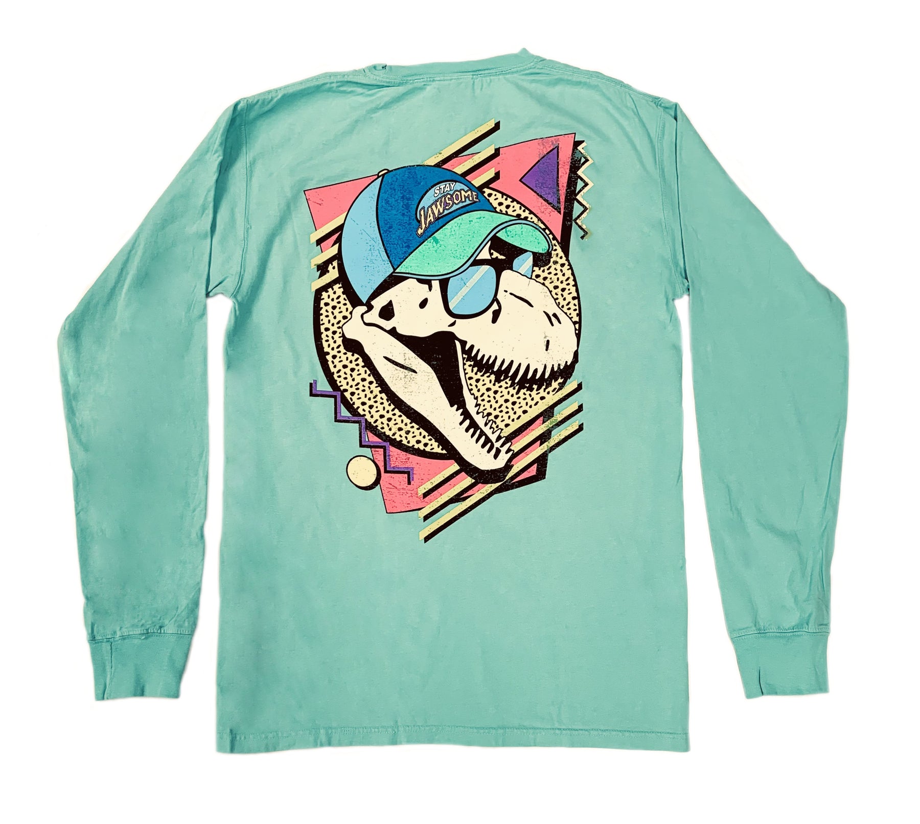 Turquoise long-sleeved "Stay Jawsome" t-shirt with a fantastically fun T.rex graphic on the back. 100% U.S.A. grown cotton. Machine washable.