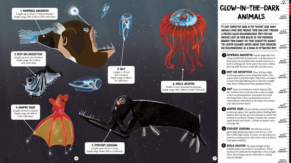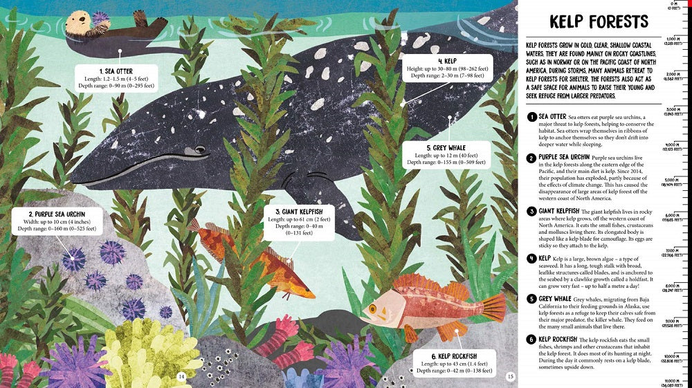 Each spread features bold, colorful and eye-catching illustrations of the different animal and plant species, plus easy-to-digest, bite-sized factoids about the creatures. A ruler running down the side of each spread highlights the different depths, and a magnetic clasp shows the entire eco-system from top to bottom.