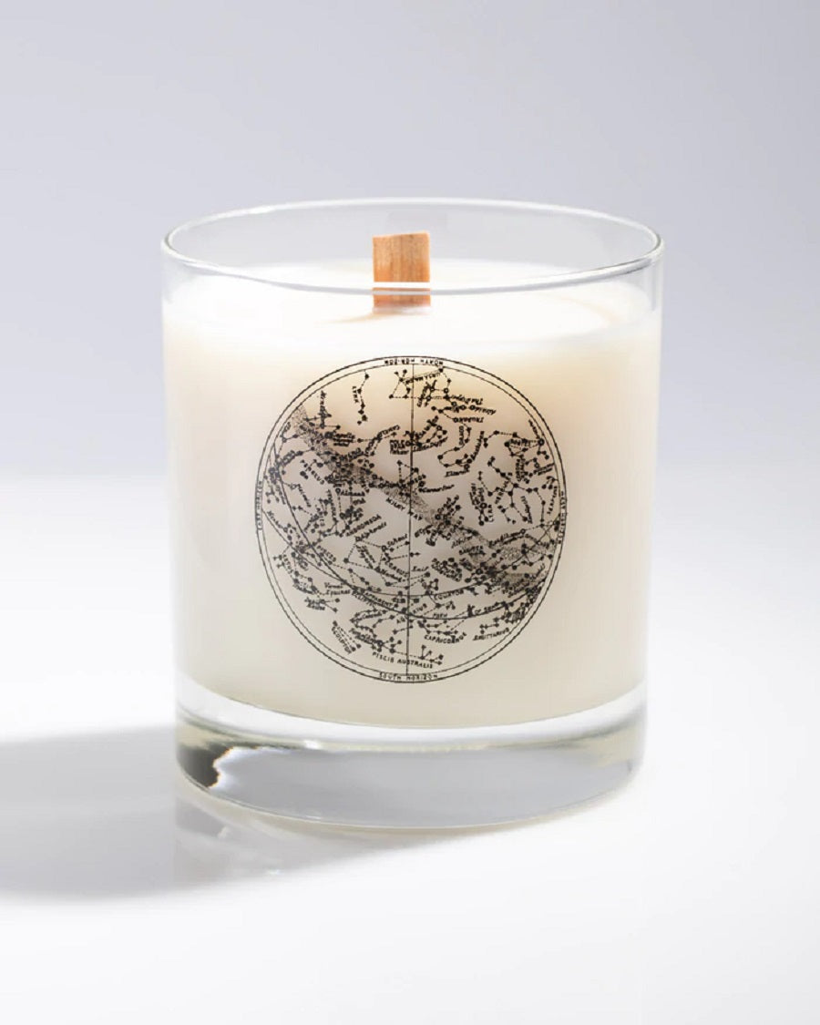 Chart your next stargazing experience with this Astronomy Cocktail Candle. While ancient astrolabes were handheld, this modern version allows you to view the constellations from the comfort of your couch. Afterwards, rinse with boiling water and toast to a brighter tomorrow. 11 oz candle scented in natural beeswax, coconut and soy. Glass can be used as a whiskey glass when candle is used. Dishwasher safe. Made in the USA.