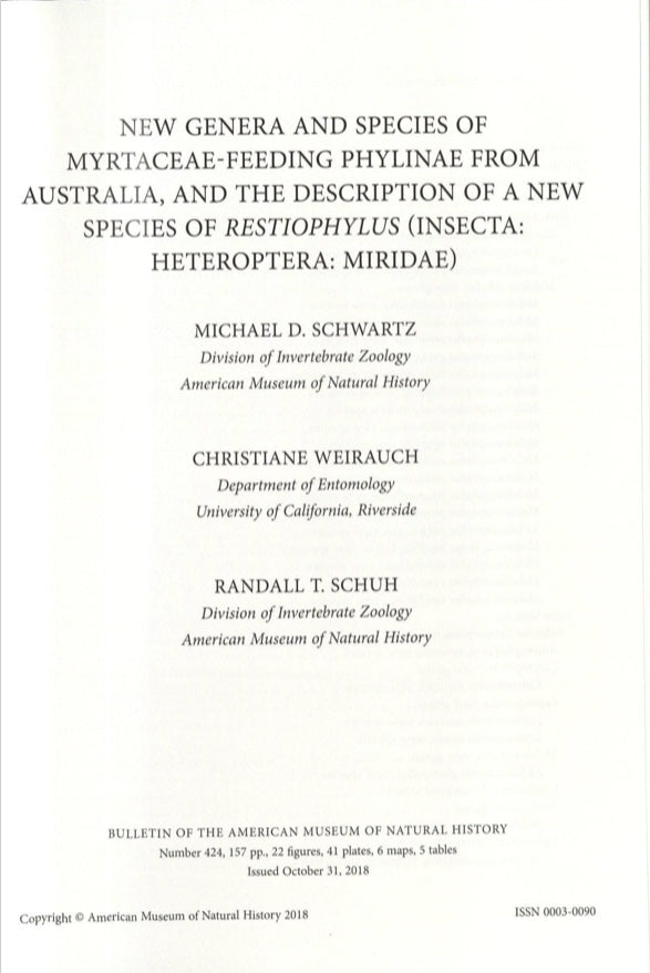 B424 (2018) New Genera and Species of Myrtaceae-Feeding Phylinae from Australia, and the Description of a New Species of Restiophylus (Insecta: Heteroptera: Miridae) by Michael D. Schwartz, Division of Invertebrate Zoology, AMNH; Christiane Weirauch, Department of Entomology, University of California; and Randall T. Schuh, Division of Invertebrate Zoology, AMNH.