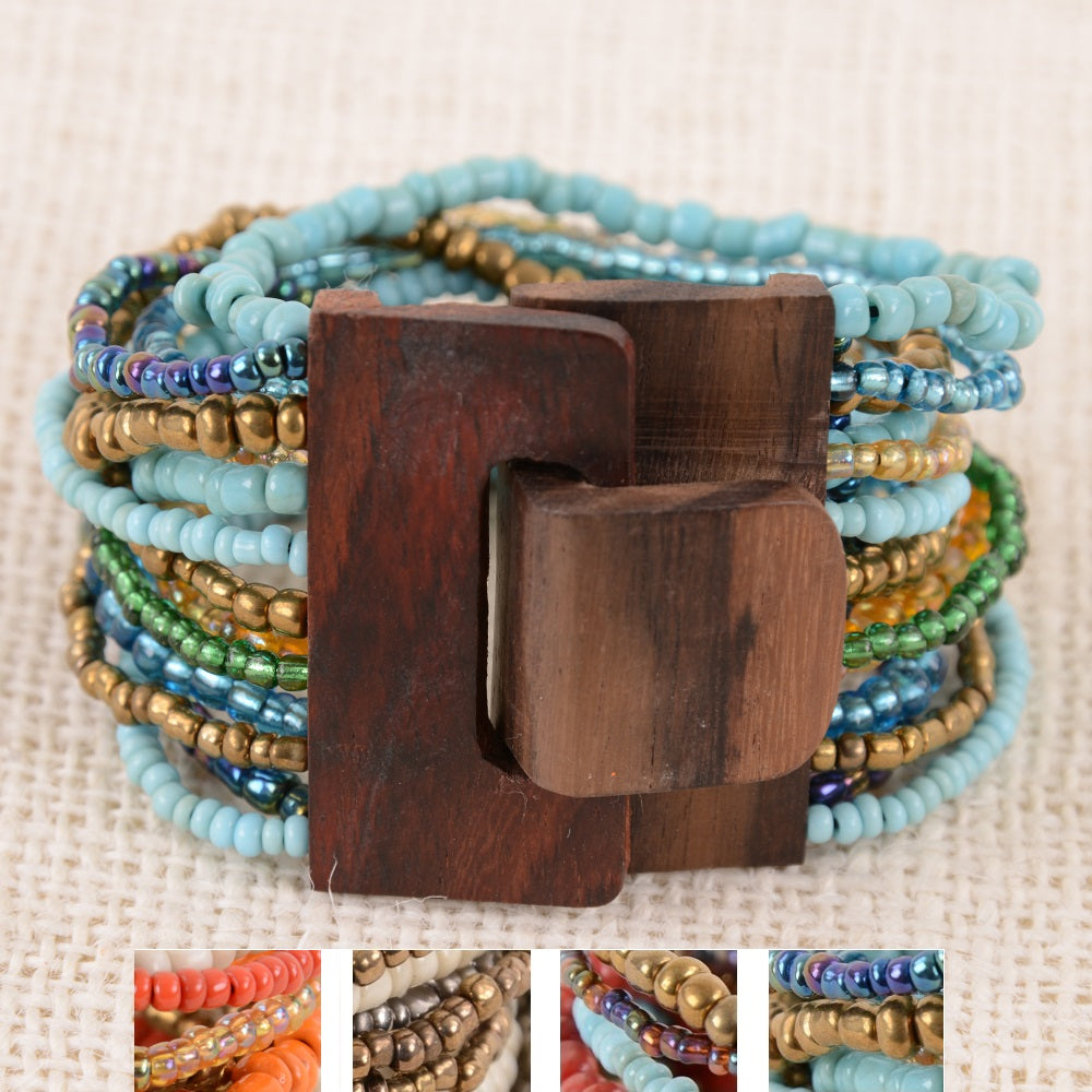 Indian Rosewood Buckle serves as an attention grabbing accent in this stylish glass beaded bracelet.