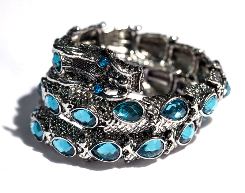 This exotic snake-shaped bracelet is beautifully textured with a raised design and finished with pear-shaped simulated gemstones. With 27 cast metal pieces hinged together, resulting in a life-like movable body.