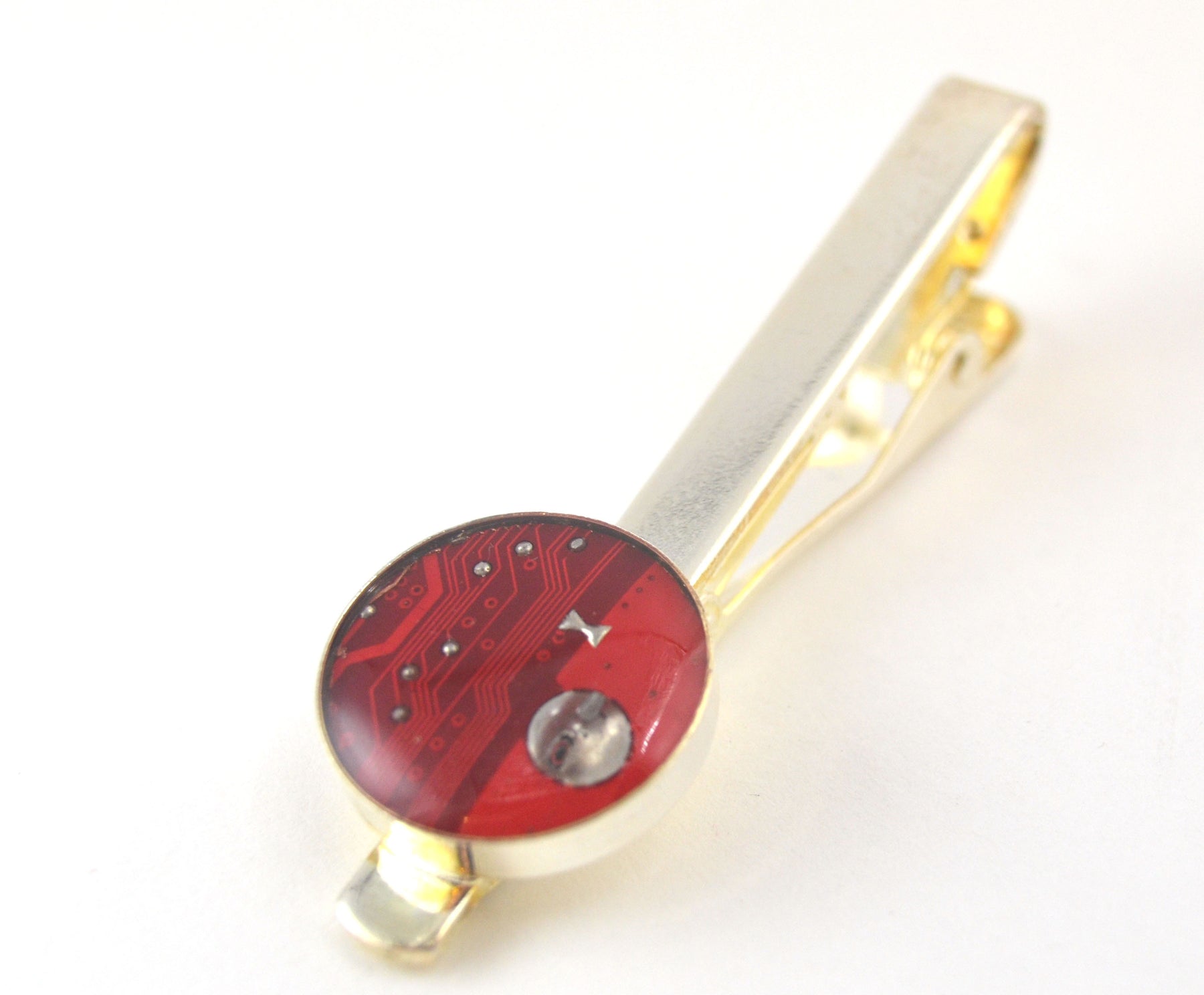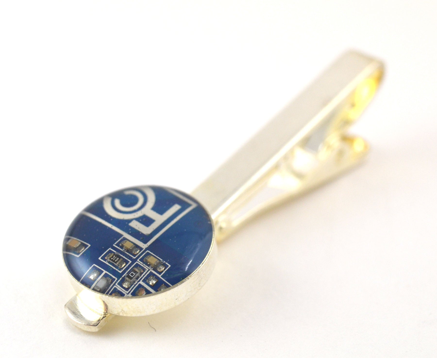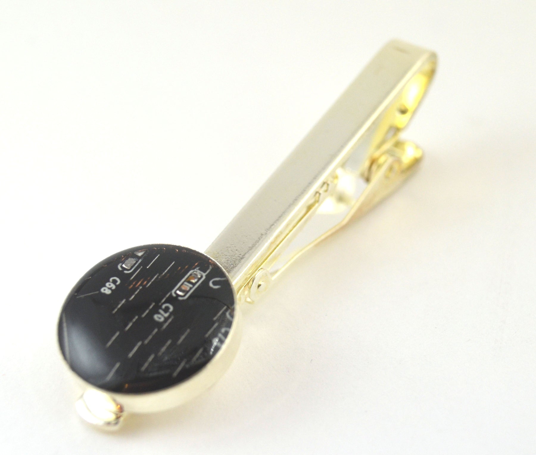 Spice up your boring tie with a really cool circuit tie bar! The silver tie bar is 1.75” (45mm) long and features a round piece of recycled circuit board nestled in a 16mm bezel. The circuit is covered in a layer of glass-like epoxy resin which provides both a protective and gorgeous finish. Simply slide the clip over your tie and let the tension of the clip hold everything in place.
