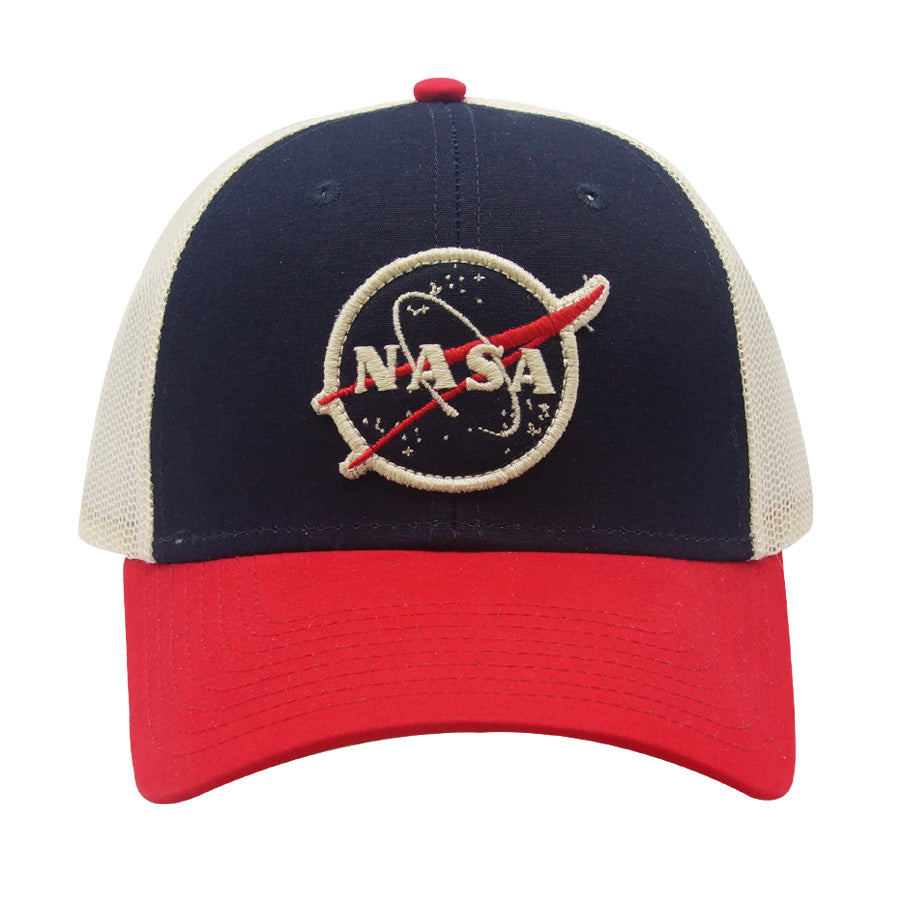 A color-blocked NASA cap that's perfect for warm, sunny days. It features a rounded crown with button detail, curved brim, and adjustable snap back. Embroidered NASA patch. 100% cotton cloth panels. 100% polyester mesh back panels. One size fits most. Dry clean.
