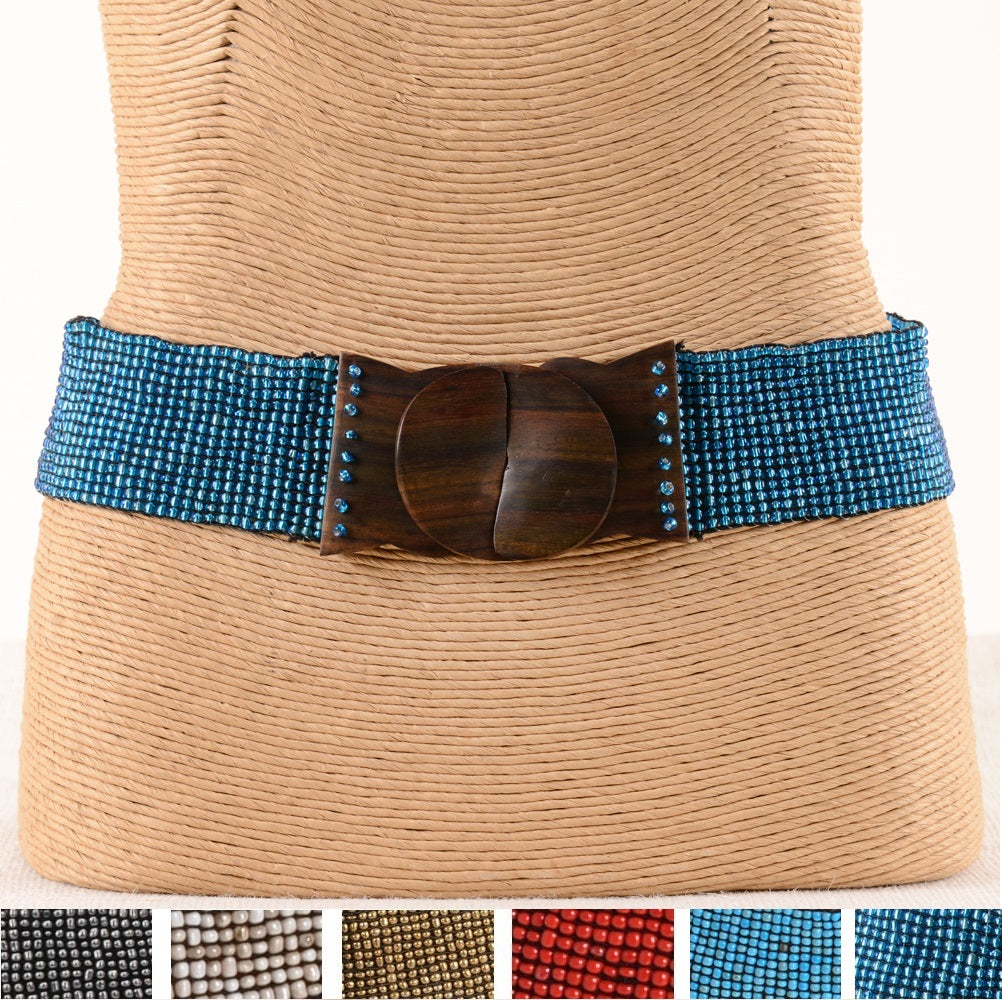Elastic waistband with glass beads. Rosewood buckle closure. One size fits most.
