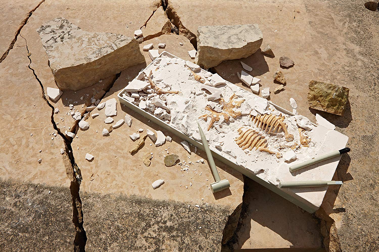 Bring home the mystery and excitement of a paleontological dig! Use the heavy-duty tools to carefully extract a dinosaur skeleton that is buried in plaster. Once the excavation is complete, the hard plastic bones can be washed and assembled to form a complete dinosaur model. Bones snap together and can be repeatedly reassembled. When assembled, the 3-D Triceratops skeleton measures over 12 inches long! Recommended for ages 8 and up.