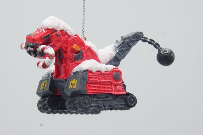 Dinotrux Character Ornaments. These fun hard plastic ornaments are from the super popular Dinotrux Series. Three assorted characters, each measuring approximately 2.5 inches tall. Choose from Dozeratops (gold), Tyrannosaurus rux (red), or Reptool (bright yellow) with cool snow and holiday accents. Price listed is for one ornament.
