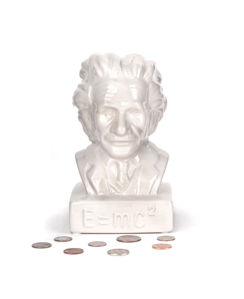 This fun and functional coin bank proudly displays Einstein's most famous equation.