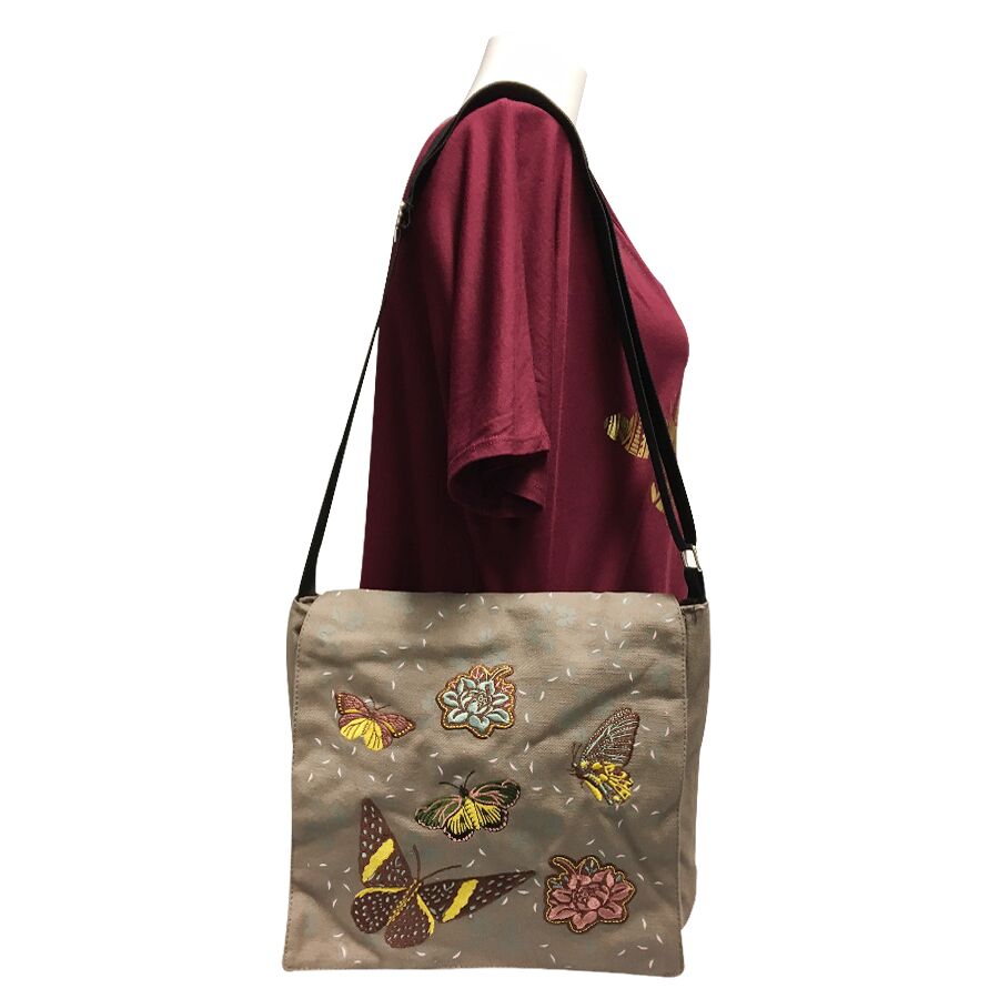 Embroidered butterflies messenger bag in lightweight cotton canvas. Zipper pocket on outside back. Velcro closure covers a double pockets on the front. Adjustable strap. Fully lined. Inside zippered pocket. Measures 10' x 7' x 2.5".