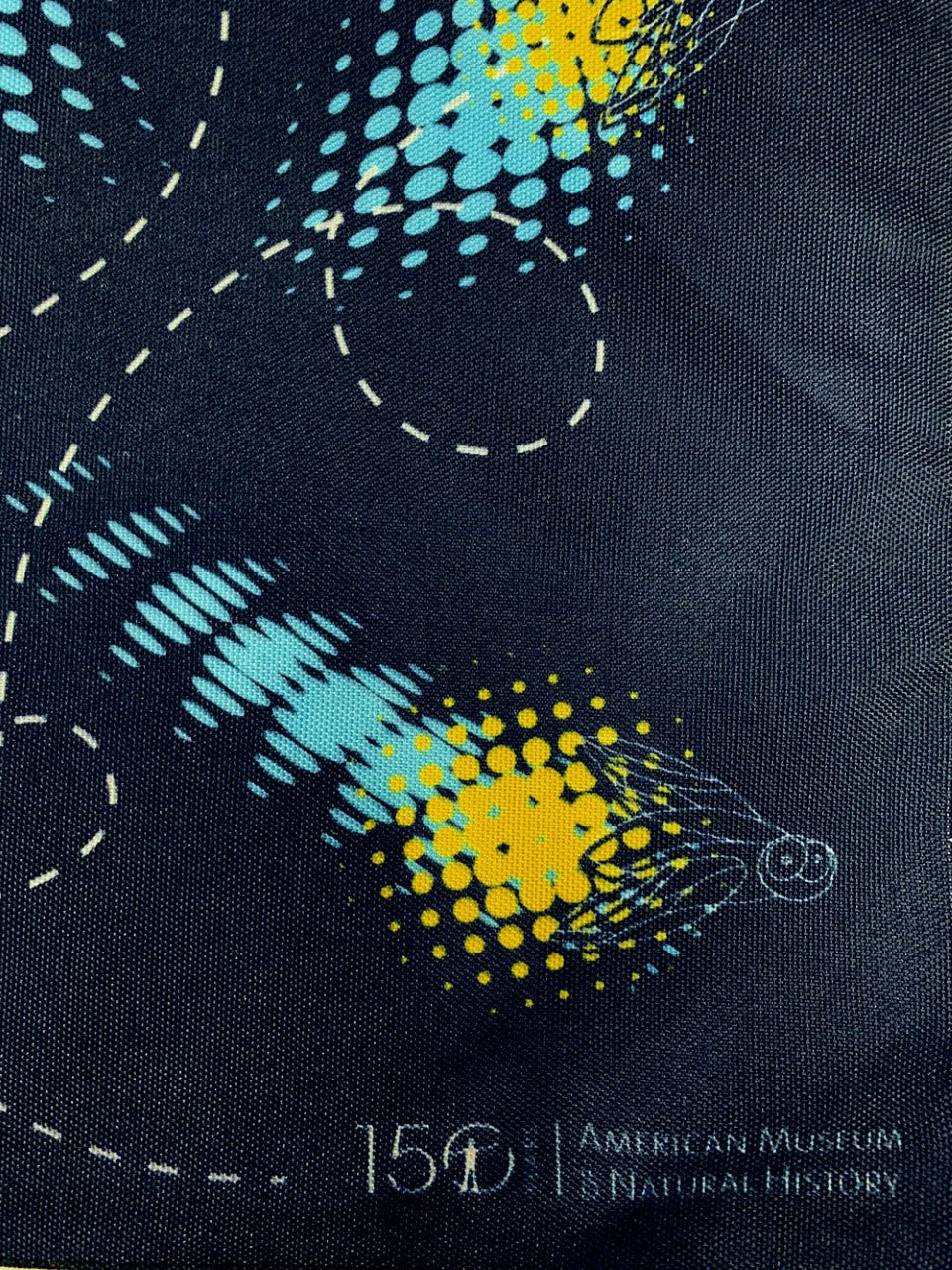 Made of recycled 600 denier material, the firefly frenzy drawstring backpack is a great item to pack for travels or use for toting books to school. It features the Museum's 150th anniversary logo and was created for the Museum's newest exhibition Creatures of Light: Nature's Bioluminescence. It has sturdy flourescent yellow drawstrings and is washable. It measures 13.5 x 16 inches.