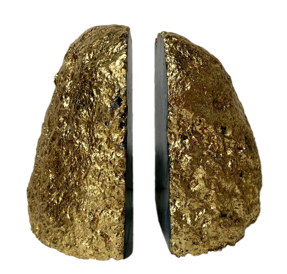 Beautiful natural agate bookends enhanced with blue dye and featuring gilt paint. Each is unique and will vary slightly from the design shown. Each measures approximately 5 x 6 inches for the complete pair. Great way to decorate your home with the beauty of nature yet they're practical too.