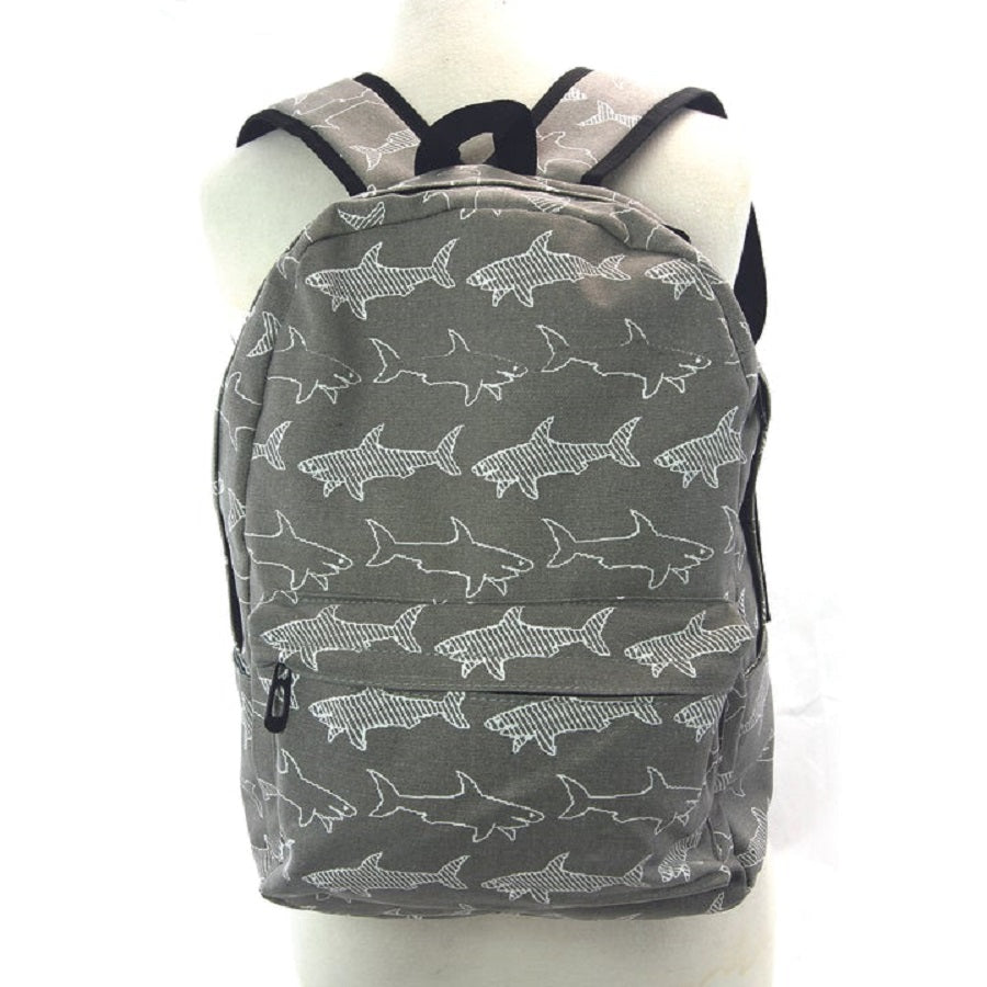 Gray sharks backpack in a quality canvas material and uniquely designed. Includes 15" maximum backpack drop and 3" top handle drop. Top zippered closure with 1 exterior zippered compartment. Fabric lined interior with padded laptop sleeve inside. Padded shoulder straps. Measures Approx: 11" (L) x 8" (W) x 16" (H)