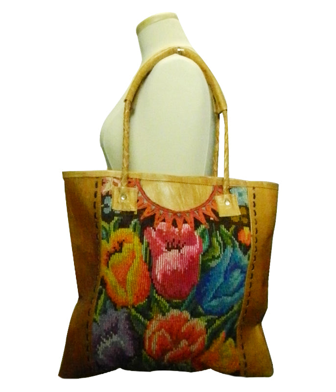 Made of recycled huipile and leather, this beautiful tote combines elegant style, vibrant colors, and durability in one. Crafted from recycled traditional Mayan blouses and sturdy handles made from richly colored leather, each piece will vary slightly from the one shown. The inside of these totes are fully lined with an additional side zipper pocket for a change purse, keys, or other smaller items. A magnetic snap keeps the top closure, and all your belongings, secure.