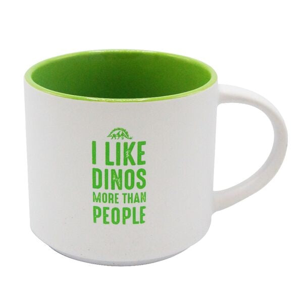Sipping from a large mug filled with your favorite beverage will help lift your spirits every time you read the humorous saying "I like dinos more than people." It's glazed in a bright, shiny green inside and a flat satin white outside. Museum logo on reverse. Holds 12 oz. Ladies "I Like Dinos" t-shirt also available.