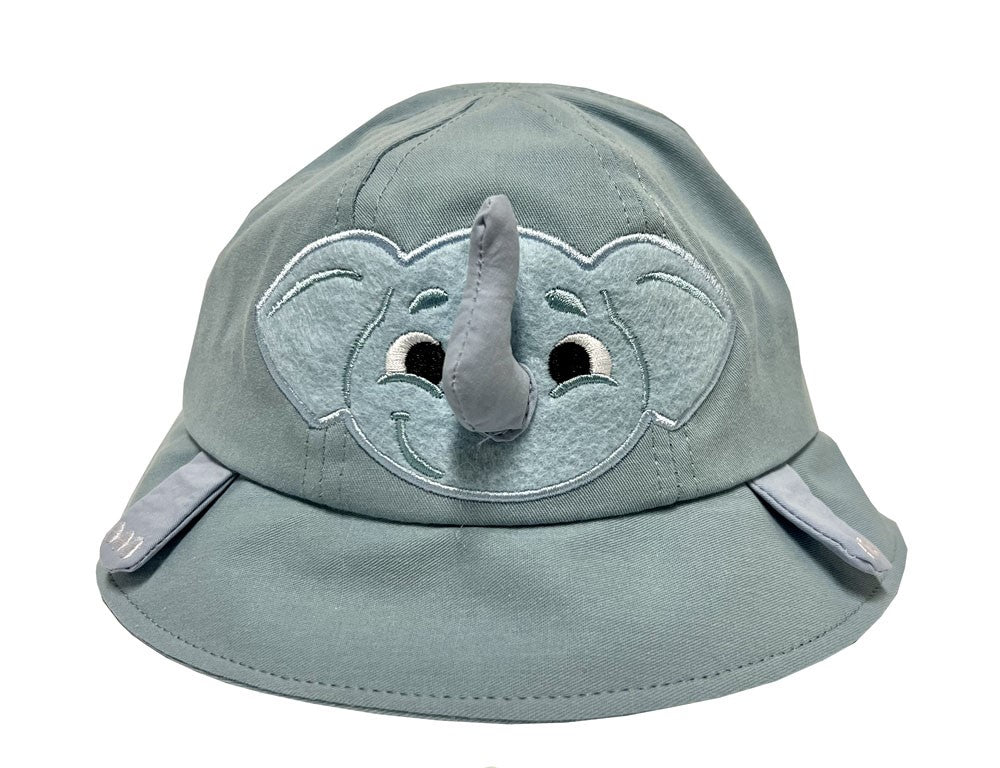 Adorable infant blue elephant bucket hat with 3-dimensional elephant trunk and feet.