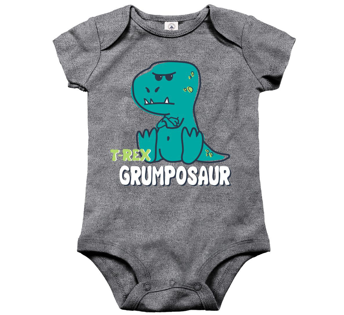 Every baby is occasionally cranky. Next time that happens dress them in this comical T.rex Grumposaur Onesie. Soft dark gray cotton blend. Snap closure. Available in sizes 6, 12 and 18 months.