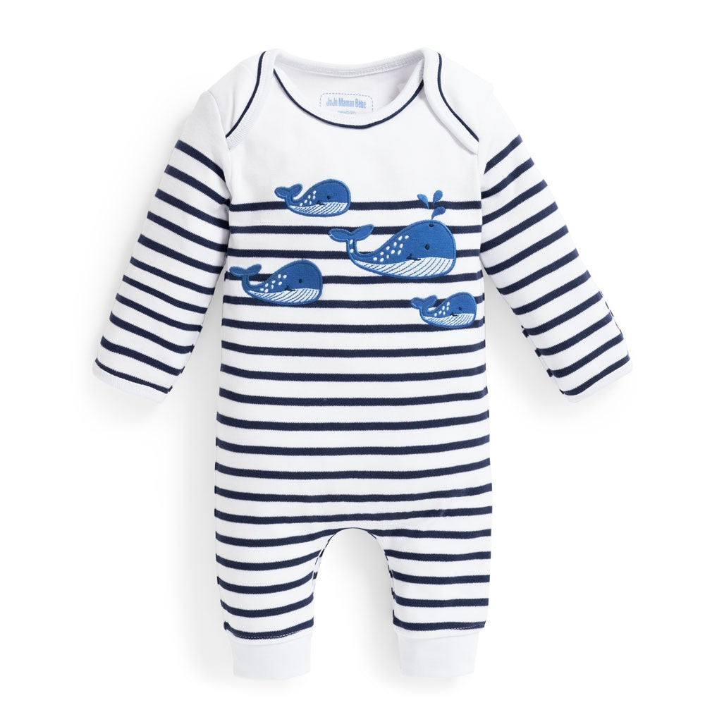 Whale Appliqué Footless Baby Romper or Sleepsuit. Nautical stripe features all over, decorated with the sweetest whale appliqués on the chest. With an envelope neck, dressing your baby is made extra easy, especially if they don't like clothes pulled over their head. Snap leg opening for easy diaper-changing. 100% cotton. Available in infant sizes 0-3M and 3-6M.
