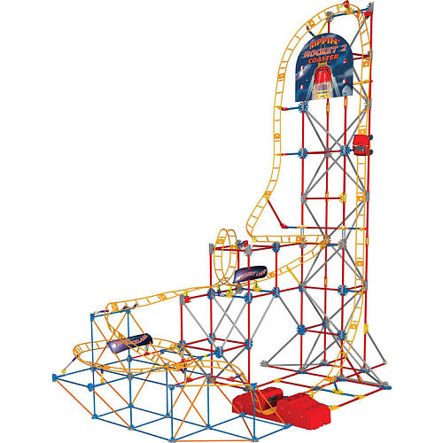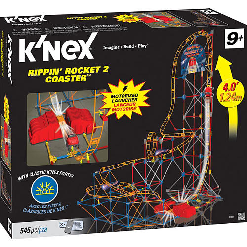 The Rippin' Rocket Returns! Build an amazing coaster that soars 4 feet high! Loaded with over 500 K'NEX pieces including classic parts, this model boasts over 20 feet of twists, turns, and daring loops. A special motorized blaster launches the coaster car into its exciting journey around the track. For more fun, go to www.knex.com to download instructions for a 2nd cool coaster. Standard parts made in the U.S.A. Special components made in China. Packaged in the U.S.A.