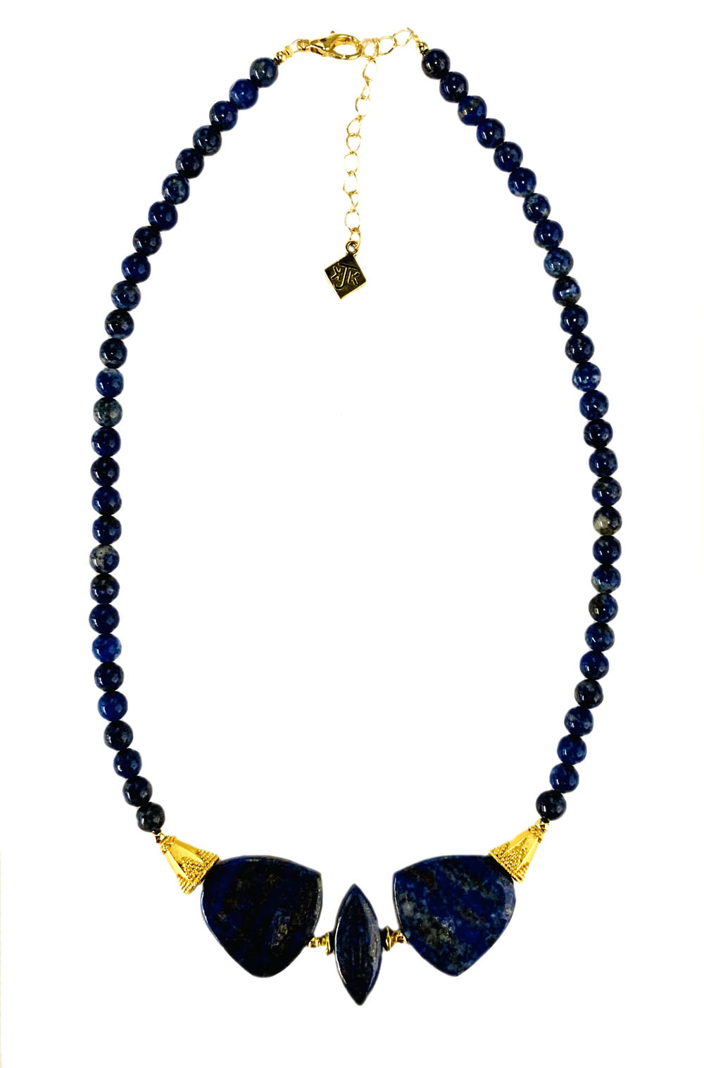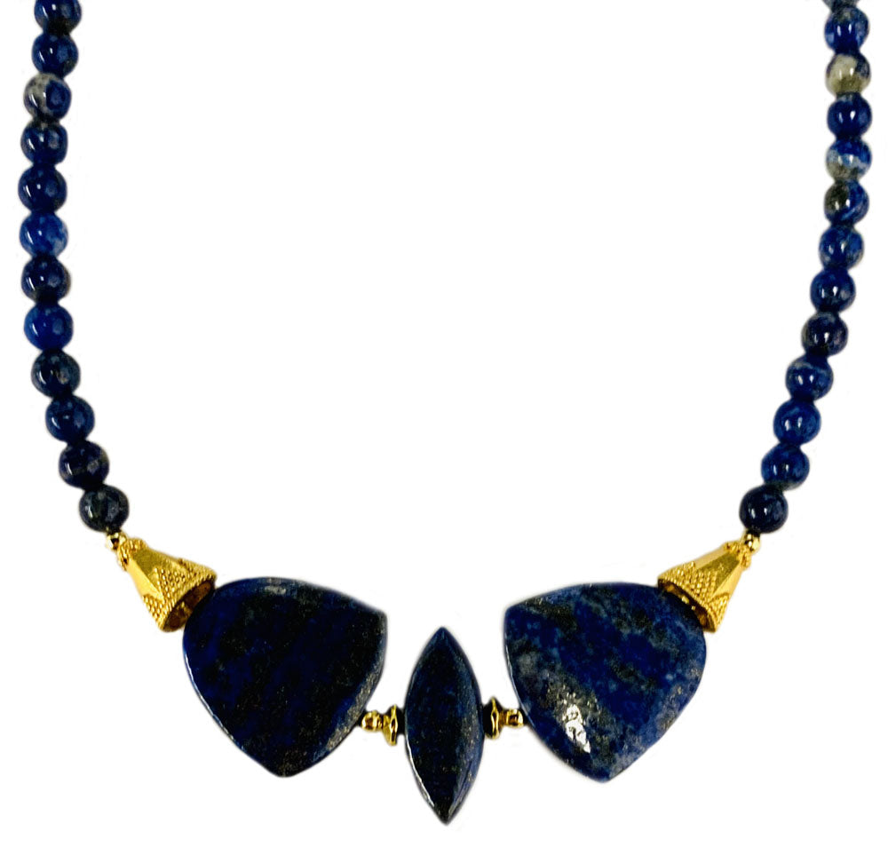 Gorgeous genuine Lapis beads and flat-shaped stones are accented by gold-plated beads, findings, lobster clasp, and chain. The necklace can be extended to 20" in length.