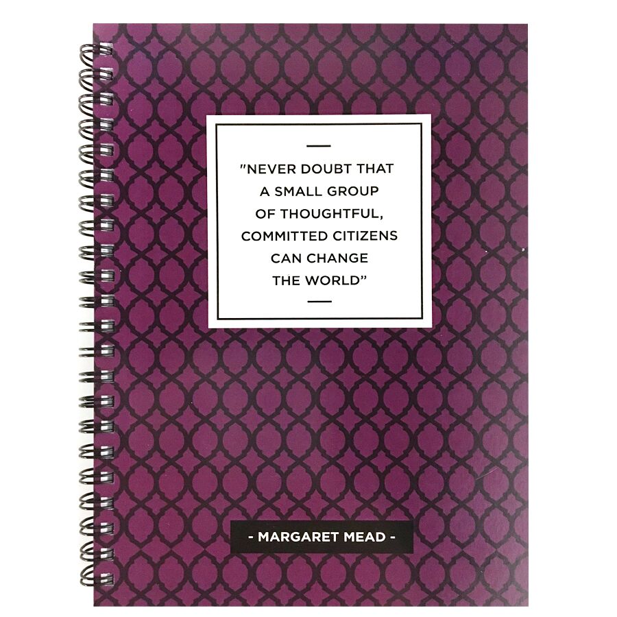 Margaret Mead wire-o spiral writing journal featuring the quote "Never doubt that a small group of thoughtful, committed citizens can change the world". 75 lined pages. 6 x 8 inches.