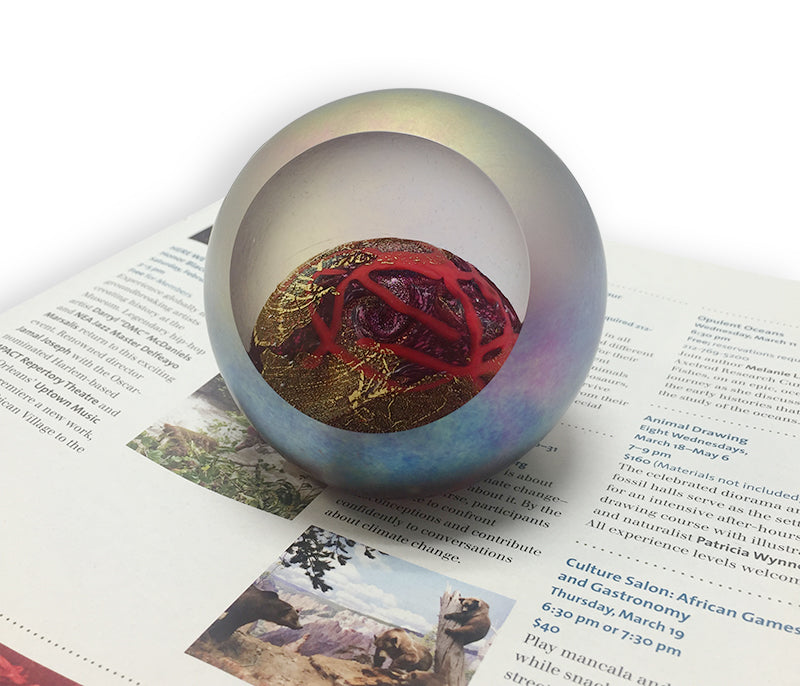 Mars is the fourth planet from the Sun and the second smallest planet in the Solar System, after Mercury. Named after the Roman god of war, it is often described as the "Red Planet." This glass paperweight is handcrafted in the Pacific Northwest, by different artisans, using ash from the 1980 Mt. St. Helens eruption. Each paperweight is shipped in a gift box with a story card.