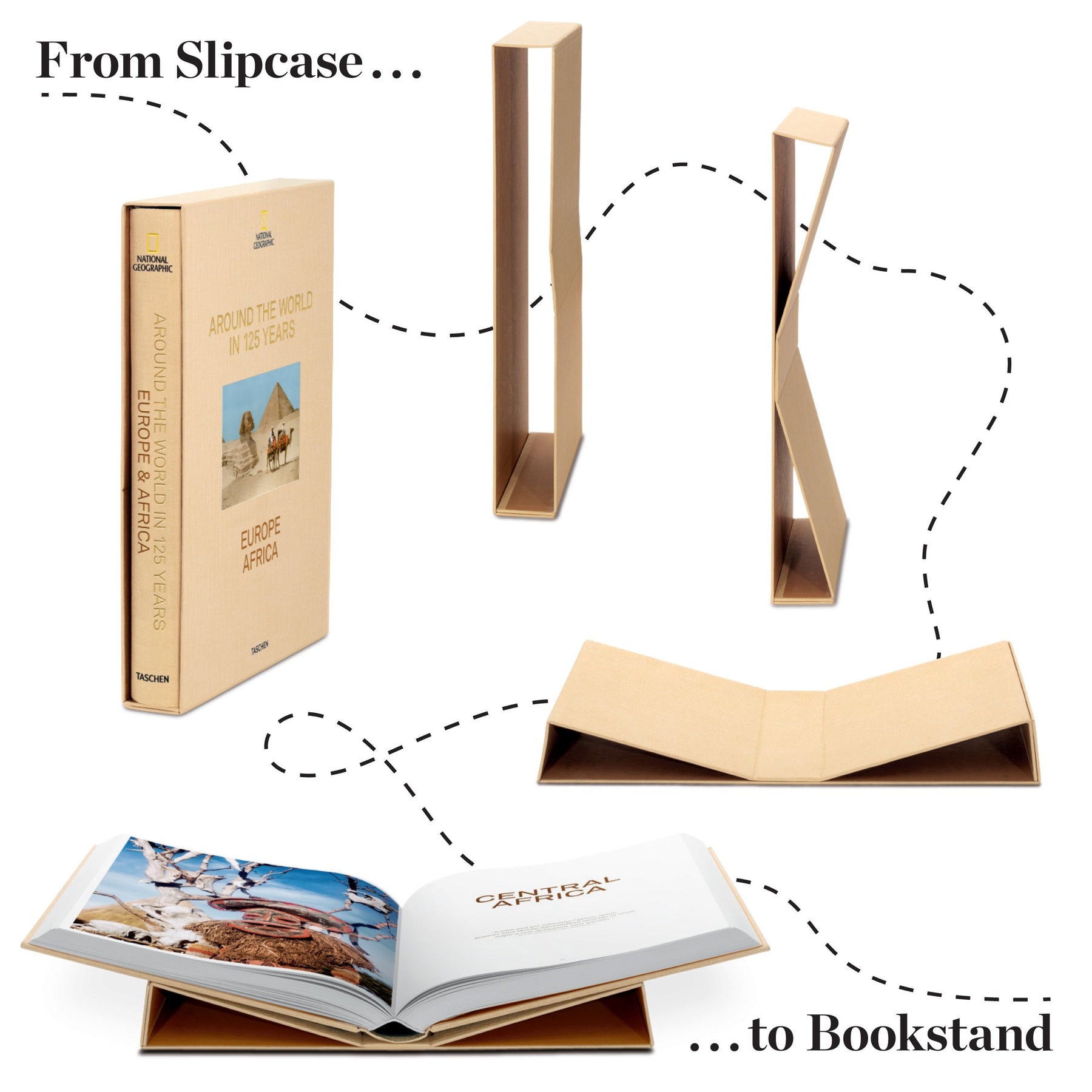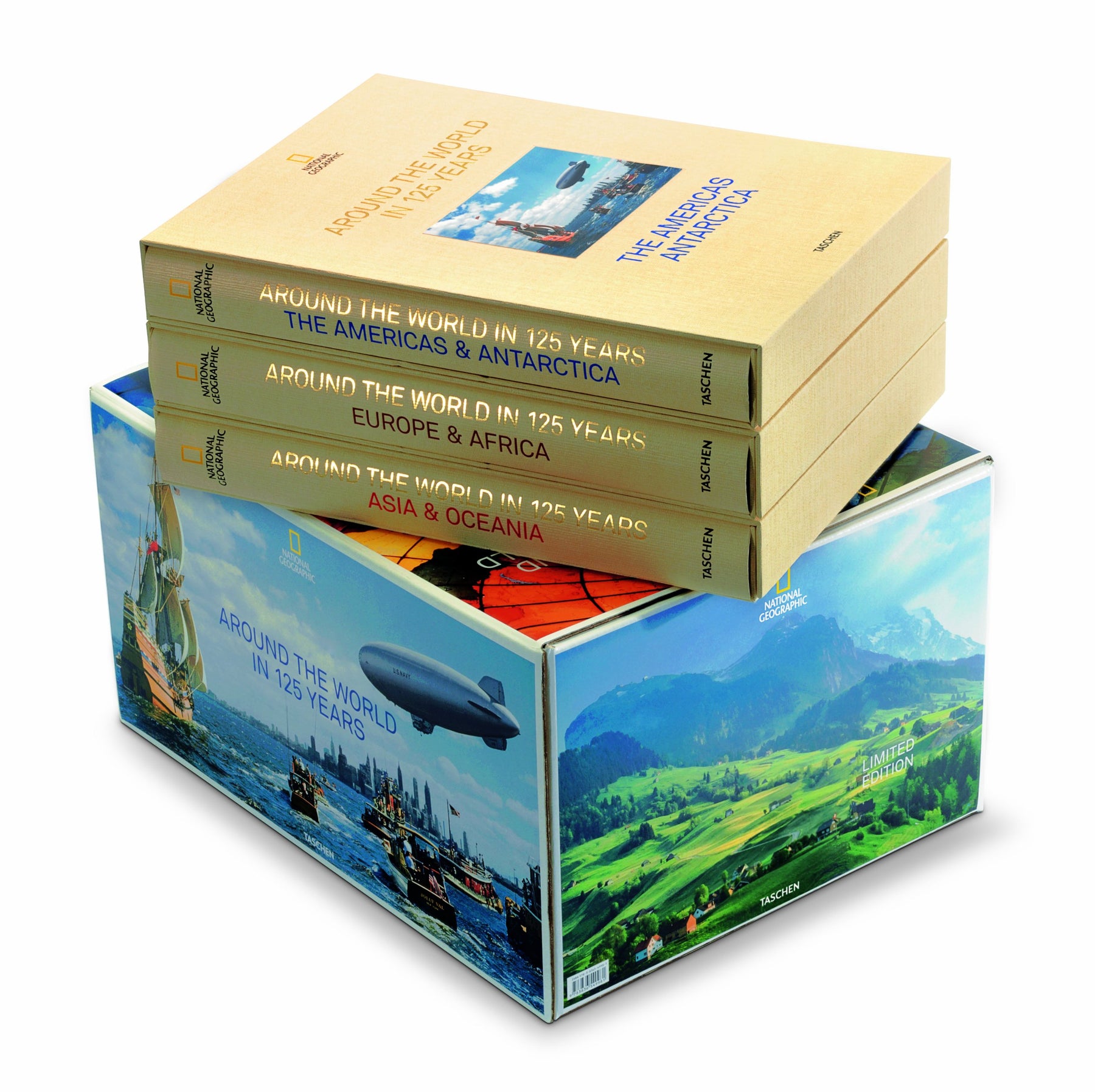 Exploring the globe since 1888, National Geographic: Around the World in 125 Years is a collection of never before published photographs collected in three volumes: The Americas Antarctica, Asia Oceania, and Europe Africa. Experience a journey through time with the world's favorite magazine. Each volume's slipcase turns into a book stand to display the book.