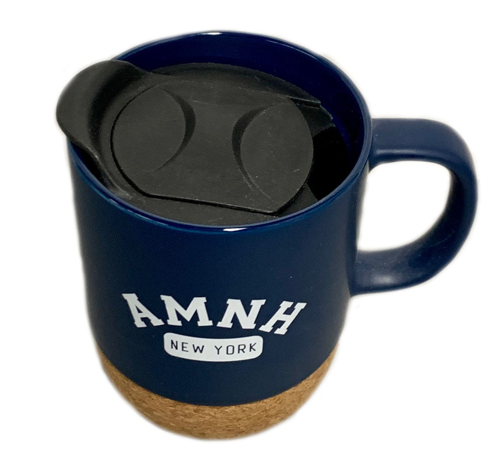 This very stylish travel mug is a great souvenir from the American Museum of Natural History. It's made of navy ceramic pottery with a cork base so there's no need for a coaster and a removable, splash-proof lid with slide closure. Holds 14 oz. Not for use in microwave.