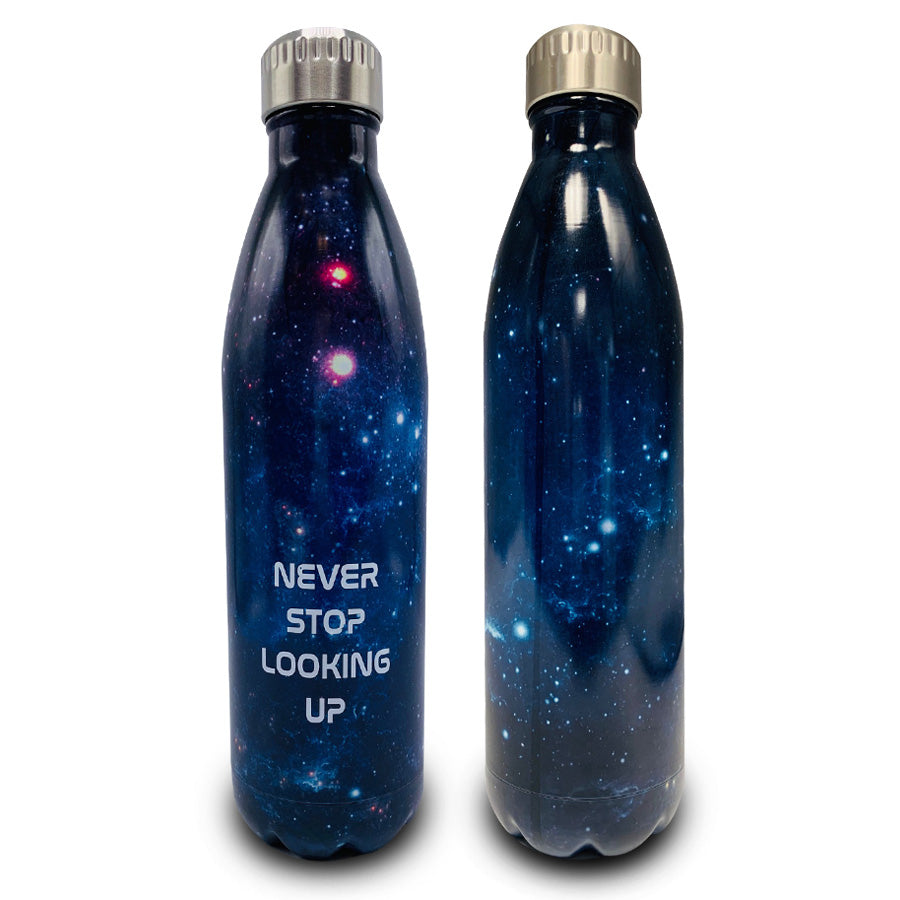 Never Stop Looking Up 25 oz stainless steel double wall hot / cold water bottle. Twist cap. Beautiful cosmic night sky design. Hand wash.