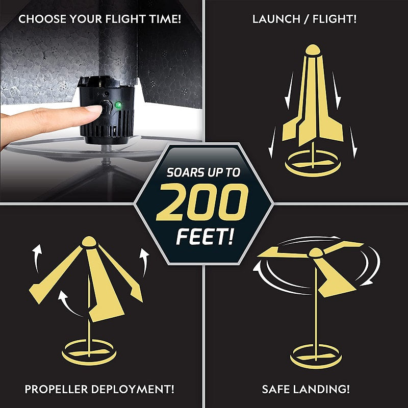 Launching the Power Rocket couldn't be easier. Once fully charged, simply place the rocket on the included launcher, then press the launch button one, two, or three times to set your flight time. Then, step back and prepare for launch! Once the Power Rocket reaches its apex, its rotor blades release, bringing it back to the ground safely and gently. And with up to 20 launches per charge, kids will enjoy sending the Power Rocket up again and again.