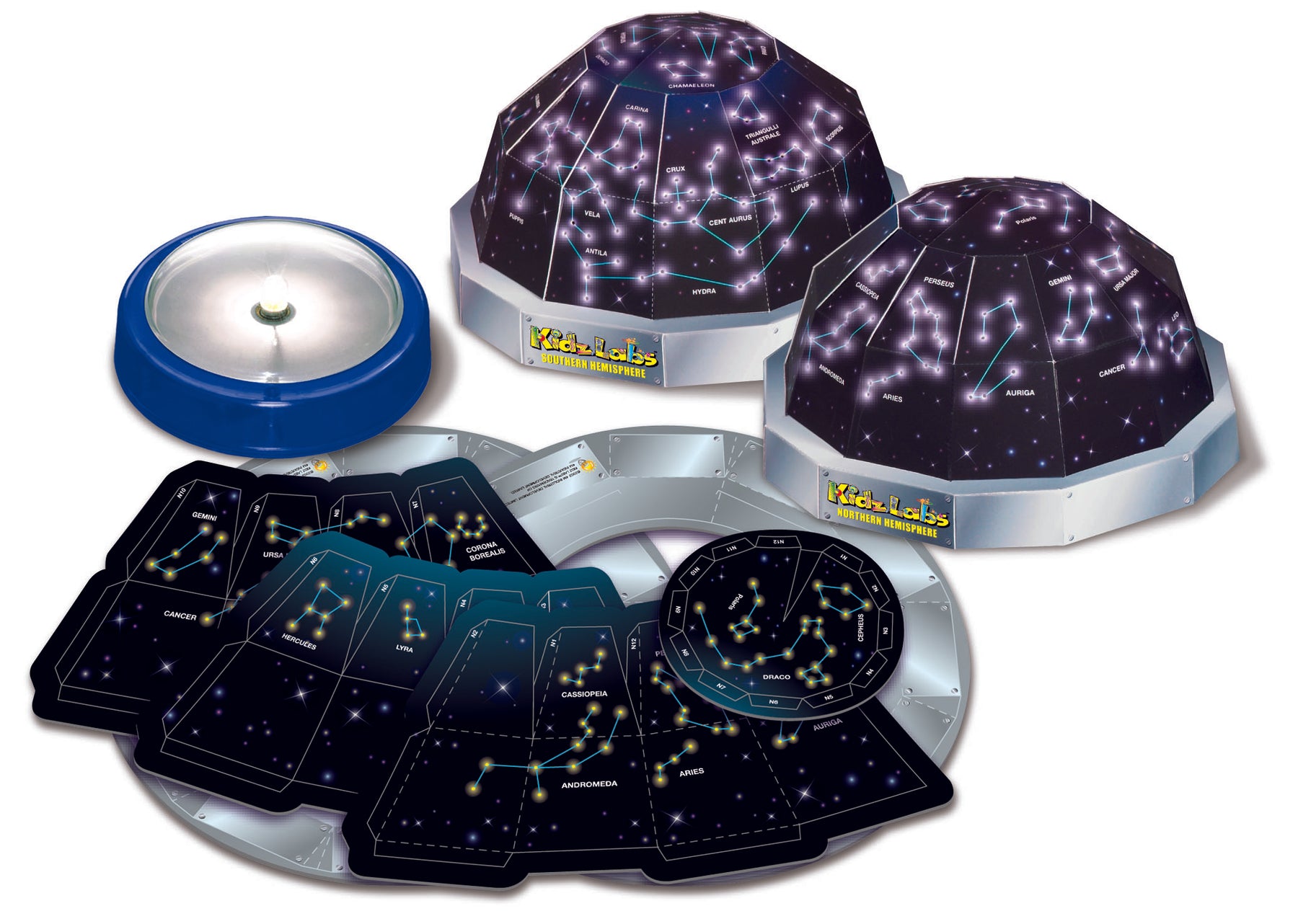Create your very own starry sky in your bedroom. Invite your friends and family for the star show. They will be amazed! Create your very own night sky domes. Punch holes onto the night sky dome, fold, and build them up. Insert the lamp provided to project your very own night sky. This Kit Includes: Night sky domes of Northern and Southern Hemispheres, Lamp, Detailed instructions including star charts of both Hemispheres and 4 1/2" diameter lamp (4 AA batteries required, not included).