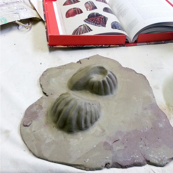 Exclusive Ocean Life-inspired marbled porcelain earring holder. Carved in the shape of a shell, this piece holds five mix-matched earring studs. Each one was carved based on shapes observed while spending time in the Milstein Hall of Ocean Life in the Museum. There are three bronze studs and two sterling silver studs. (Each stud has sterling silver post and clutch.)