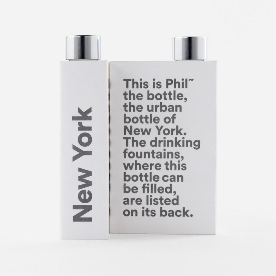 Phil the bottle is the compact, small and precious city bottle that was designed for tap water. Phil the bottle, produced in Italy, is dedicated to New York City. On the back side of each one there is a list of the locations where to find the city €™s public drinking fountains to €œfill € the bottle, which becomes a sort of analog APP. This list of drinking fountains reminds us that every city has a privileged relationship with water, the most precious and often forgotten public asset. Phil the Bottle New York is an amusing invitation to use more tap and less bottled water.