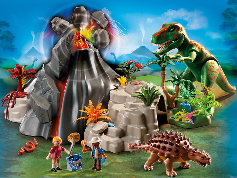 Watch out as you dig for precious fossils at the prehistoric Volcano! The active volcano can explode at any second and a dangerous Tyrannosaurus is lingering nearby. Set includes two figures, two dinosaurs, volcano and landscape, rocks, trees and flowers, research tools, fossils, and other accessories.