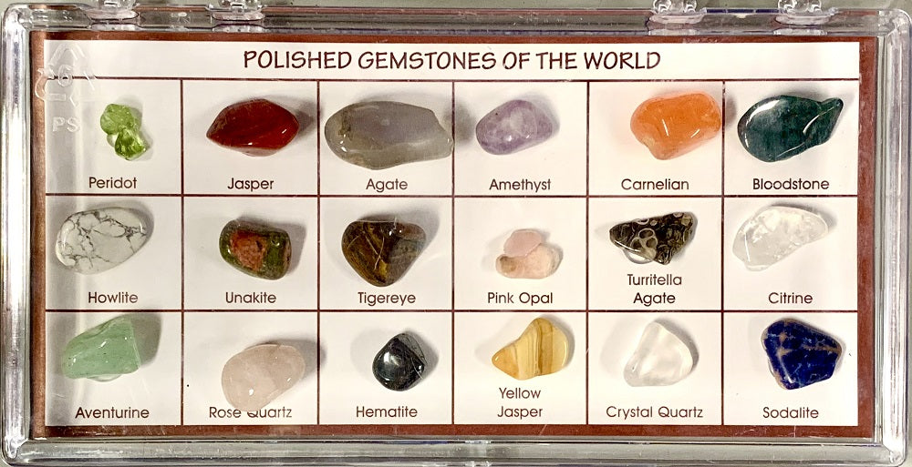 The large collection measures at 7"x3 1/2". This collection is pretty and practical, and would look nice mounted on a wall with double-faced tape. The Polished Gemstones Collection contains the following 18 specimens: Peridot, Jasper, Agate, Amethyst, Carnelian, Bloodstone, Howlite, Unakite, Tigereye, Turquoise, Turritella (Agate), Citrine, Aventurine, Rose Quartz, Hematite, Yellow Jasper, Crystal Quartz, and Sodalite.
