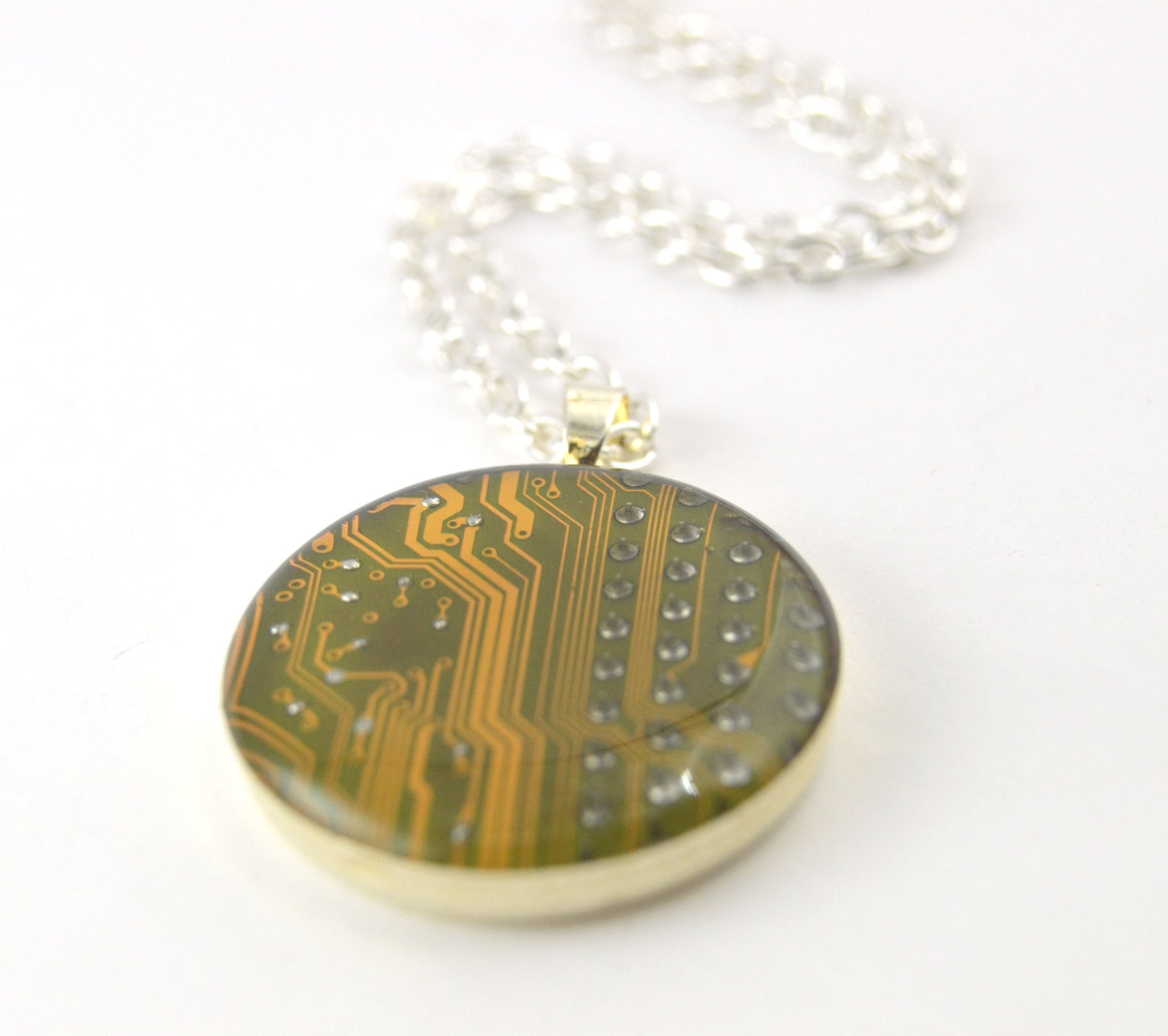 The penant is a hand cut piece of circuit board with interesting surface components. It rests in a silver plated bezel and is covered in a domed layer of clear, shiny resin. The pendant is about 1.25" tall (32mm) including the bail.