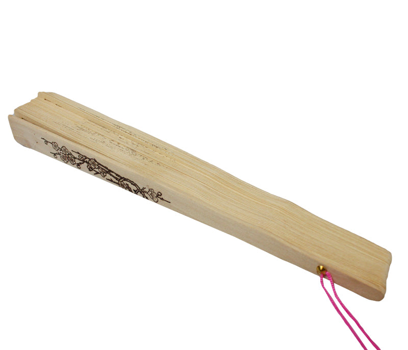 This intricate fan is made of sandalwood with an intricate design and sets on a carved stand. The pieces are held together by fishing line and each fan comes with a tassel.