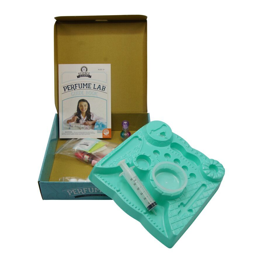 The Science Academy Perfume Lab makes it easy, safe and fun to learn how to create your own perfume formulas using natural ingredients. In this kit you'll explore essential oil extraction, perfect your own line of perfumes, and discover the smell of science. The colorfully detailed guide booklet includes step-by-step instructions, helpful hints for experimenting and a data chart to help you record your formulas. Ages 3 and up.