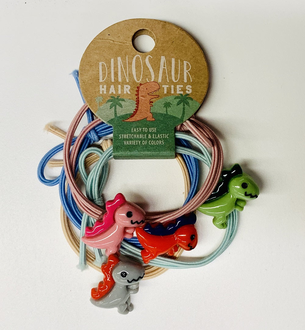 Adorable stretch hair ties with tiny comical acrylic dinosaurs. Set of four different colors. Safe for ages over 3 years.