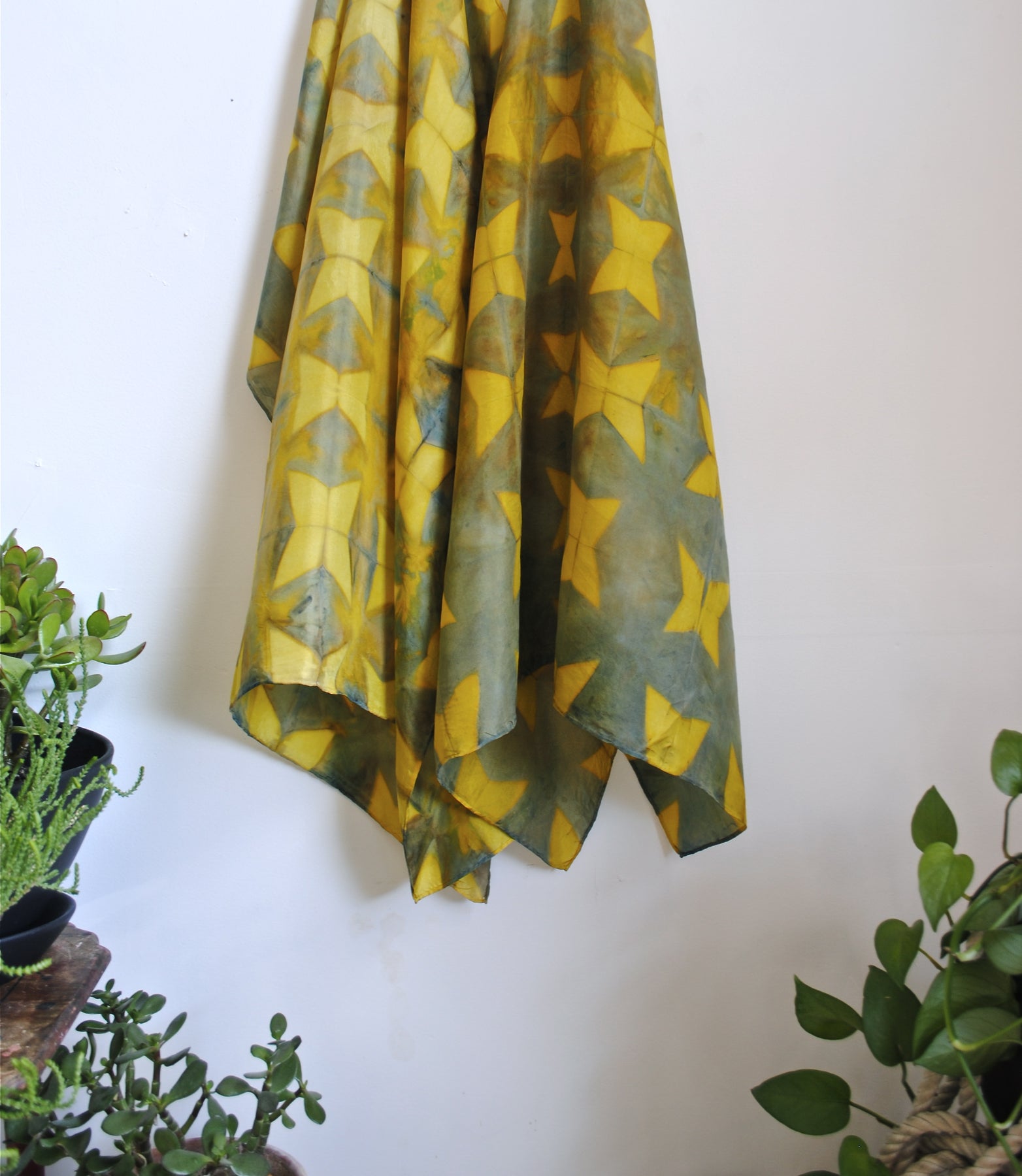 Star Pattern Natural Fusticwood and Indigo Shibori Dyed Silk Scarf