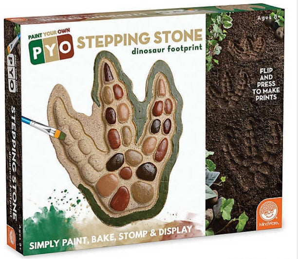 The dinosaur trend is larger than life and MindWare €™s newest Paint Your Own Stepping Stone kit will make a giant impression! This dino footprint does double duty: first by creating mysterious tracks in the ground, then as a custom-painted garden accent. These all-weather stepping stones are ready to paint right out of the box, no messy cement-mixing required. Oven bake the painted stone for a weather-resistant finish. Kit contains 10 € x 9 € cement stepping stone, 12 paints, a paint brush and painting guide