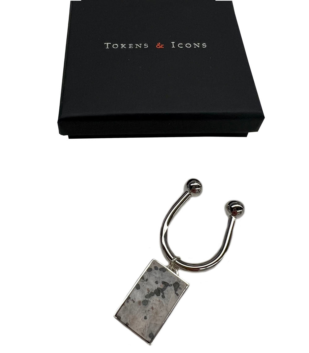 This key ring is crafted from authentic rock removed from Sterling Hill in 2018 for the American Museum of Natural History's exhibit. The Sterling Hill slab showcases some of the 90 fluorescent minerals species present when under UV light. Sterling silver ring. Gift box included.