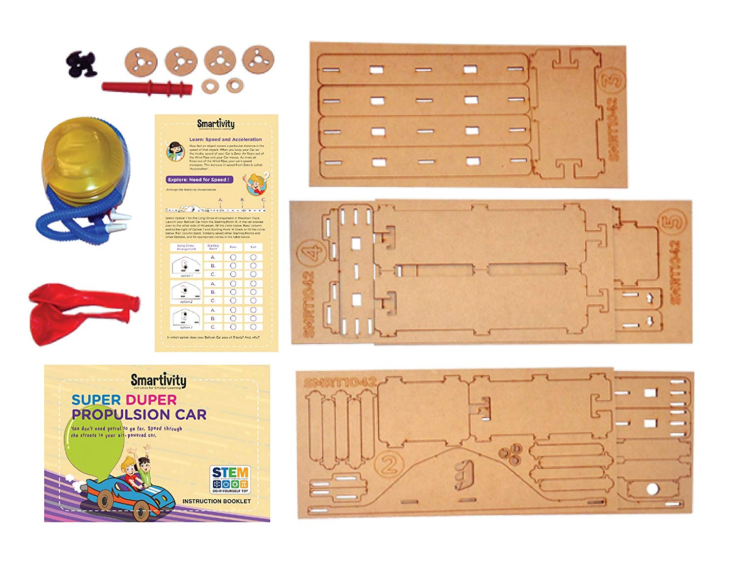 Introduce your child to the power of jet propulsion and thrust with Smartivity Super Duper Propulsion Car S.T.E.M. Educational D.I.Y. Toy Kit. A redesign of our most popular activity project in the 6+ age-group, the Super Duper Propulsion Car now comes with extendable tracks and additional learnings about friction and gradients.