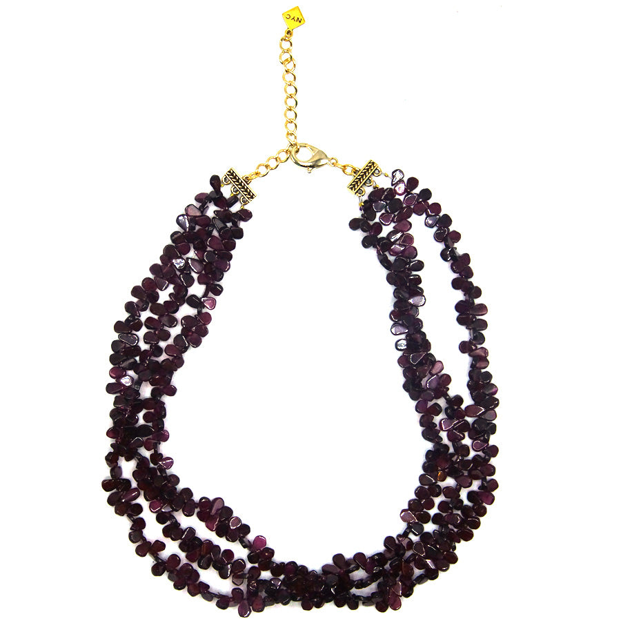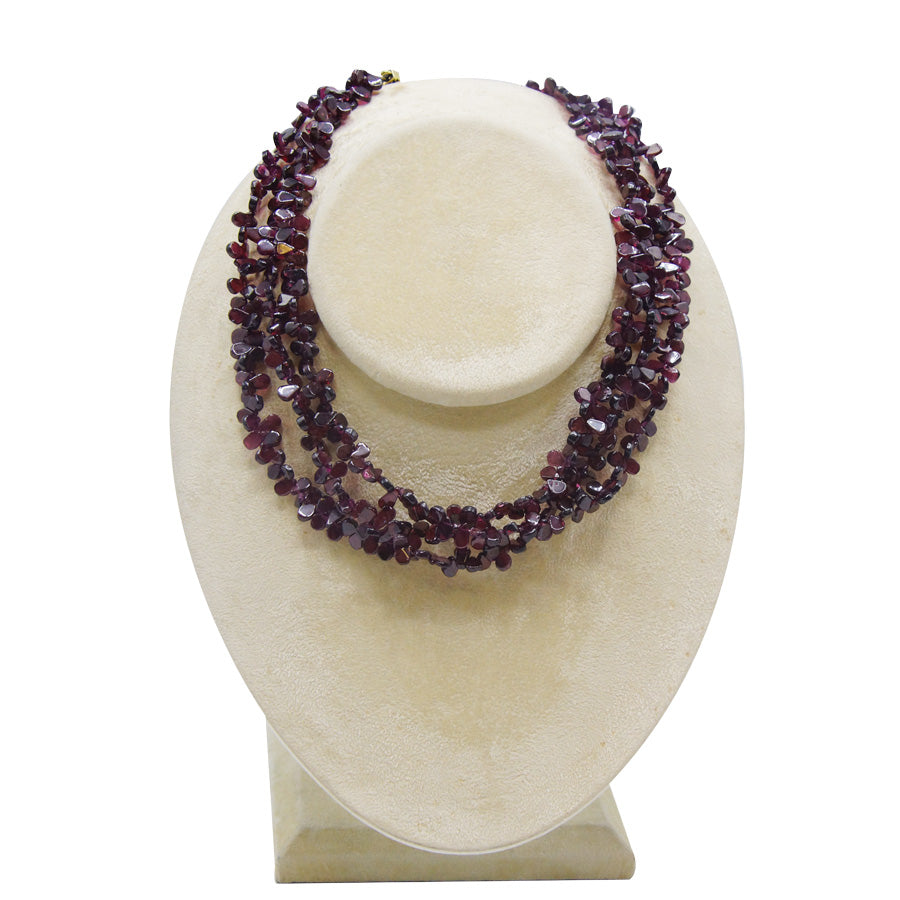 Garnet has been valued since ancient times. The name garnet derives from the Latin word "granum" meaning seed, because of its likeness to pomegranate seeds. Garnet is the state gemstone of New York. This gorgeous 3 strand necklace is made of genuine garnet beads. It has a gold adjustable clasp and matching earrings are available (sold separately).